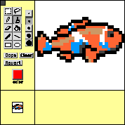 Once we have a drawing we like, we close the drawing editor window, and the object in the copy box appears as a clown fish. We now drag out a couple of fish and scatter them around the game board.