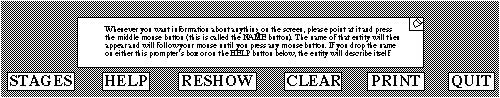 Laura starts by selecting the HELP button from the control panel at the bottom of the screen (see Figure 1). Selection of the HELP button causes the "prompters box" to fill immediately with "procedural help" suggesting something that the designers might want to do next. When they select HELP initially, the procedural help message that appears explains that they can always obtain "descriptive help" about anything that they can see on the screen.