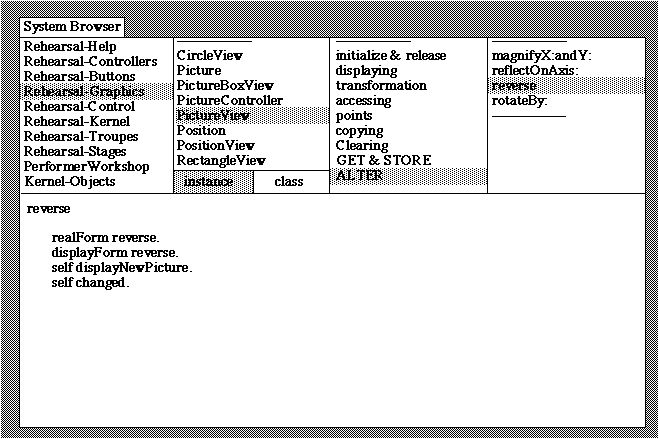 Figure 3. A Smalltalk browser showing the Rehearsal-Graphics category, the PictureView class, its ALTER category, the message named reverse from that category, and the method associated with that message.