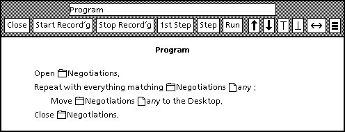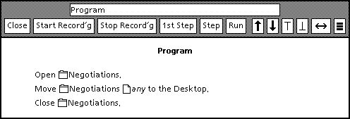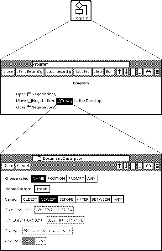 The program in Figure 3 contains references to two different data descriptions created during program recording. One description specifies a folder named "Negotiations"; the other is for a document named "Treaty". SmallStar originally chose descriptions that specify these icons by name. However, the user could later change these descriptions to choose the icons by other criteria.