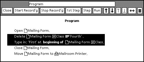 To execute a recorded program, the user presses Run in the program window, or chooses Run from the program icon or button pop-up menu. Single-stepping the program is also possible, using the First Step (start from the beginning) and Step (continue stepping) commands. If the program encounters an error while running, it stops, displays an error message, and indicates which statement caused the error.