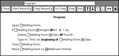 To do so, the user first writes a program that unconditionally changes "Fourth" to "First" in the Class field in the mailing form, and then prints the form. The user then selects the statements that should be executed conditionally. Figure 10 shows the program, with those statements selected.