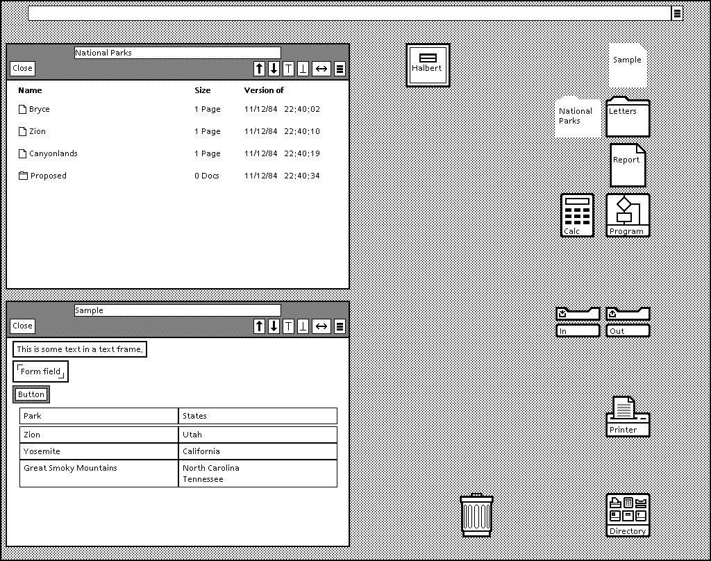 Figure 1 shows a typical Star desktop. The icons on the desktop include documents, folders, file drawers (directories on remote file servers), printers, and in- and out-boxes. Every icon has a name. Two icons may have the same name even if their contents differ. In Figure 1, a document and a folder have been opened; their contents are shown in the two windows.