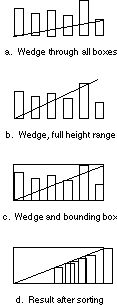 Later, when Pam invokes this program again from the tasks menu, Basil will create a sweepline and spacer as before, inviting the user to edit the spacer, since its endpoints are inputs. Then it will do the entire sort, regardless of the number of boxes. It will sort correctly, provided the boxes are initially aligned at the bottom so the sweepline does indeed select them in order by height.