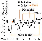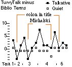 We also compared the dominance of TurvyTalk in talkative versus quiet users. Figure 10 shows the TurvyTalk minus user concept counts for each event. Although TurvyTalk dominates more in talkative subjects overall, note that when problem cases first arise (colon in title, Michalski) the talkative subjects lapse more deeply into their "native" language. Perhaps the most interesting point, however, is that on the second occasion they use more TurvyTalk.