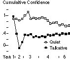 If we compute a progressive average measure for quiet versus talkative users, we get the curves shown in Figure 13. This shows quiet users starting out with an advantage, perhaps due to their strong focus on the task and lack of interaction with Turvy. The talkative users, after recovering from the initial shock of answering Turvy's questions in task 2, slowly increase in confidence. The quiet ones gradually lose their advantage, perhaps because they are not learning as much TurvyTalk (compare with Figure 10).