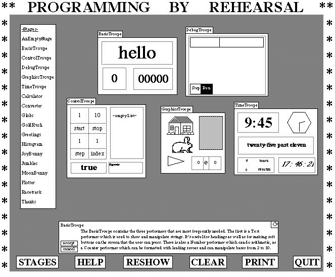 We gave them a tour of the system and within 45 minutes Dan and Diane had taken over and were using the Rehearsal World themselves. They started by investigating a simple production we had made about probability and soon suggested and implemented some improvements. They found out how it worked by looking at the button actions and change actions of the performers, both on stage and in the wings. By the end of the first afternoon, they had turned it into a game that bore only a slight resemblance to our original exploratory activity. In the process, they had auditioned Texts, Numbers, Lists, and Repeaters to discover their capabilities, dealt some with the blocking of the stage, written a fair amount of code by watching, and understood about button actions, change actions, and repeat actions.