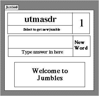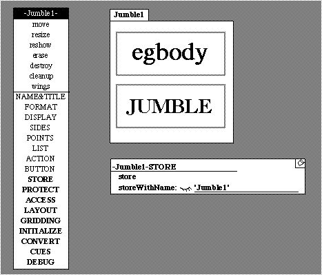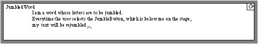 They discover through rehearsal that the setJumbled cue produces a random permutation of the characters in the text. They enjoy looking at the different bizarre configurations that jumbling a word can produce and decide to explore no more, but to make a jumble game as their first design exercise. As often happens, interaction with the design environment itself leads to a creative idea.