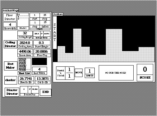 They had other design criteria as well. They wanted the game to configure itself differently every time the START button was selected, and they also wanted to make it easy for a designer to specify an easy cave, with broad floor tiles and very little variation in the ceiling, or a hard one. They wanted to have a score that was expressed as a percentage of the available gold dust; they wanted some sort of disaster to occur if the student made the fraction too large and the broom touched the ceiling. They decided to call their production GoldRush (see Figure 13).