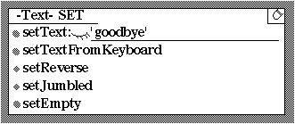 Our novice designers proceed to rehearse the Text performer by sending it various cues. Laura tries move and resize and gets a pleasant surprise when the fonts change so that the text always fits within the performer's borders. She selects the SET category and gets a cue sheet showing the list of cues that have to do with setting text (see Figure 4). Some cues like setText: take parameters that are indicated by parameter lines next to the cue. They use the help system to discover that they can type any string as a parameter to the setText: cue. Bill types "goodbye" on the parameter line. When Laura selects the cue, "goodbye" appears in the Text performer.