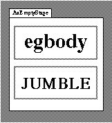 Laura and Bill use the resize cue to make the Text performer fill most of the top half of the stage, and then they copy it to make a second Text performer (exactly the same size as the first) in the bottom half of the stage. Bill types the word JUMBLE into it, as this is what they want the user to see. With the blocking thus completed, they decide to give each of their performers a mnemonic name that describes its purpose; they call the performers JumbledWord and JumbleButton. Now they are ready to define the action of the bottom Text, which they want to act as a button.