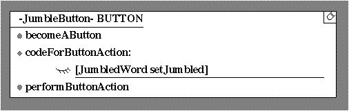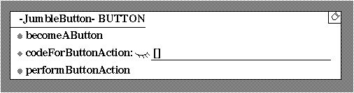 After Laura sends the becomeAButton cue to the JumbleButton, it no longer responds to selection by providing an editor; instead, it simply flashes. It is now a soft button on the screen, but it has no action. They must show it what to do.