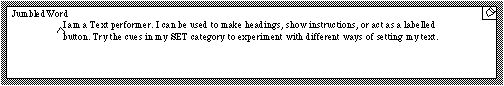 Laura and Bill's initial idea for their simple production is to use two Text performers, one to be placed above the other on the stage. The top Text is to contain the word to be jumbled and the bottom one is to act as a soft button (a button on the screen which, when the student selects it with the mouse, causes something to occur). In this case its action will be to cause the jumbling of the top Text (see Figure 5). Laura uses the copy cue to put a Text performer on an empty stage.