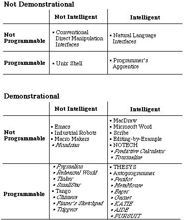 Systems that are not demonstrational, programmable or intelligent are the conventional user interfaces, including non-programmable command lines and most direct manipulation systems. The intelligent, non-demonstrational, non-programmable interfaces include most of the systems developed by AI researchers, including natural language understanding, intelligent help, etc. All of the conventional systems that allow the user to program in the interface are included in the category of programmable, non-intelligent interfaces. This includes the Unix Shell and the programming language embedded in Emacs (called MockLisp in some versions). A system that can be classified as intelligent, programmable, and not demonstrational is the Programmer's Apprentice [Rich 88], which uses AI to help the user create programs.'